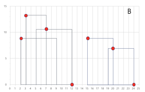 For instance, the skyline in Figure B should be represented as:[ [2 10], [3 15], [7 12], [12 0], [15 10], [20 8], [24, 0] ].